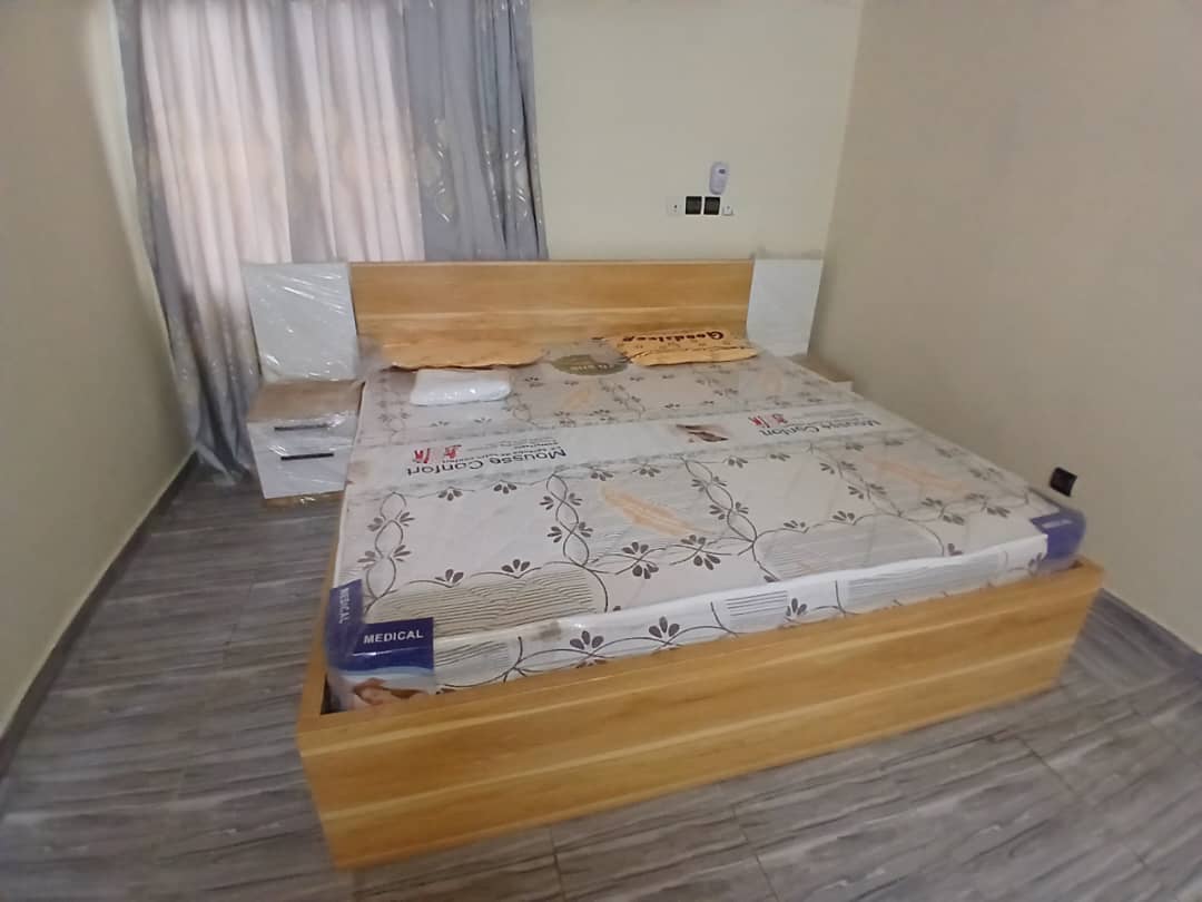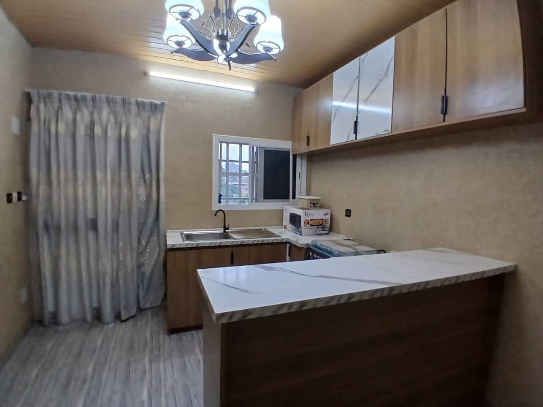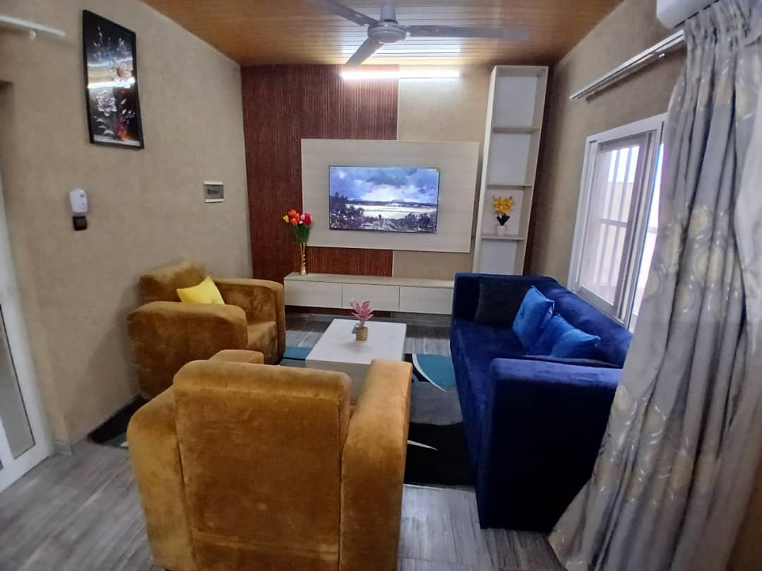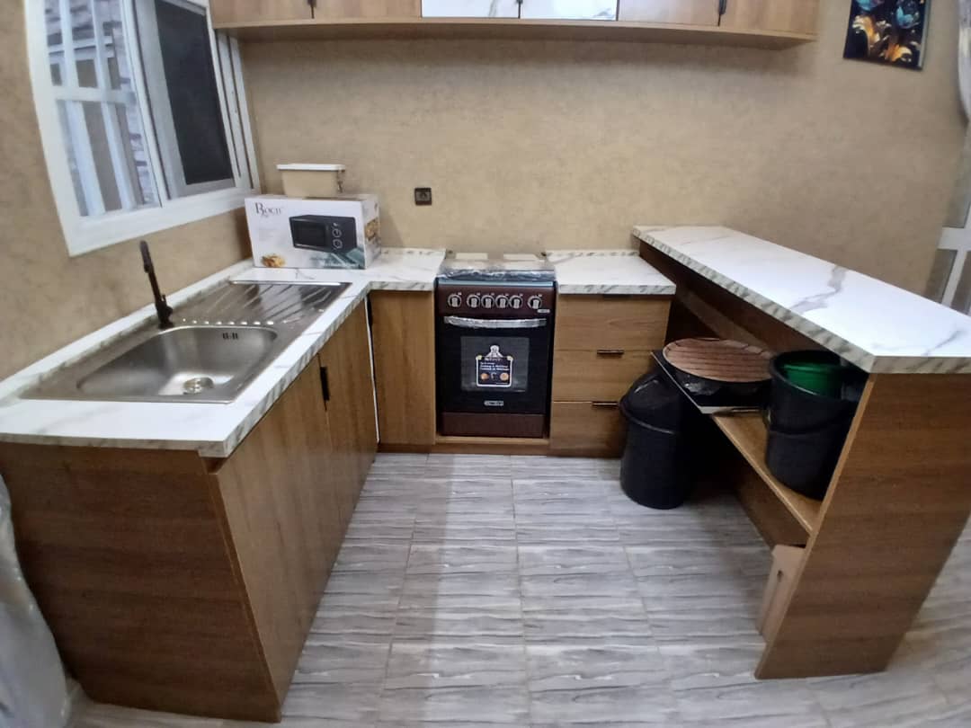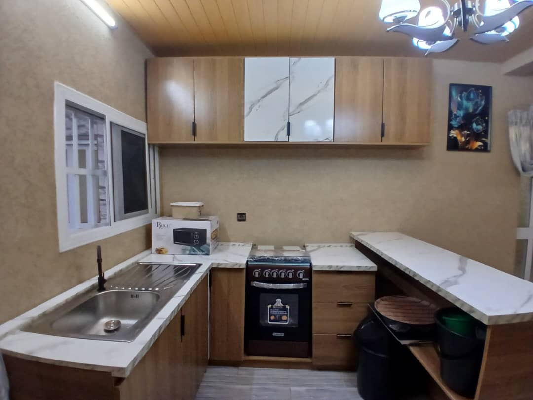 Appartement meublé très chic d’une chambre salon wc douche interne avec une cuisine américaine. Machine à laver, Wi-Fi, smart TV. Agent de sécurité et garage disponible.